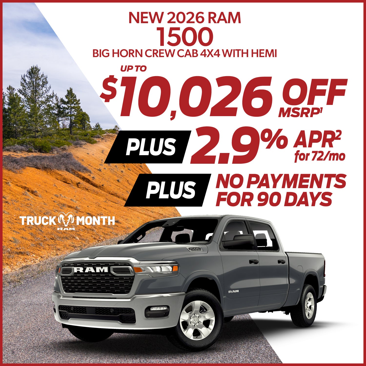 1) Offer valid on purchase of new vehicle equipped with 5.7L V8 HEMI MDS VVT eTorque engine. See dealer for details. Take new delivery 4/30/26. 2) Must finance with Stellantis Financial. Not available with lease and some other offers. Take new delivery 4/30/26.